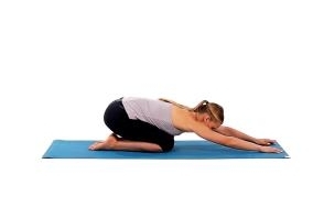 Allow your torso to relax onto your thighs and your forehead to rest on the ground. Breathe here for at least three deep breaths, aim for 30 seconds if it is comfortable to do so.